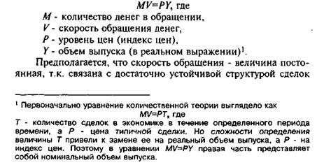 Приведенное выше уравнение количественной теории MV=PY называется уравнением Фишера. Используется и другая форма этого уравнения, так называемое кембриджское уравнение: M=kPY. Коэффициент k, однако, несет и собственную смысловую нагрузку, показывая долю номинальных денежных остатков (М) в доходе (PY). Строго говоря, величины У и k связаны с движением ставки процента1
