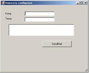 Результатом нажатия на меню «Получить почту», будет загрузка входящих писем в верхнее поле. Результатом нажатия на любое письмо, будет загрузка текста письма в нижнее поле. Для отправки письма нужно загрузить окно «Написать письмо» (рис 3.5.3) в меню файл. Результатом нажатия кнопки «SendMail» в окне «Написать письмо» будет отправка Эл. письма адресату. Результатом нажатия кнопки «выход» в меню «файл», будет выход из программы.
