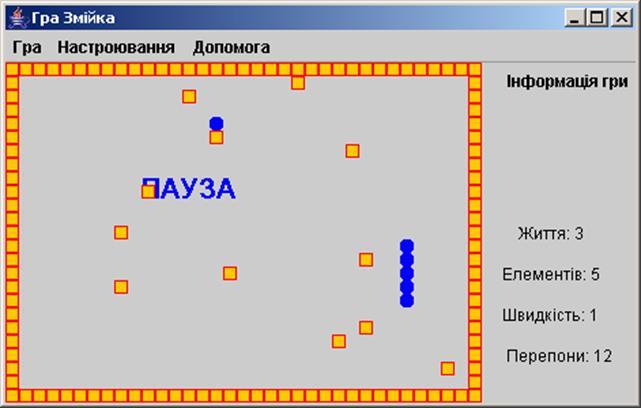 Об’єкти-пункти меню: «Гра» з вкладеними підпунктами «нова гра» - розпочинає нову гру, «пауза» - тимчасово припиняє гру, «зупинити гру» - зупиняє поточну гру, «вихід» - дозволяє вийти з програми. Підменю «швидкість гри» з меню «Настроювання» дозволяє змінити швидкість руху змійки.