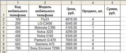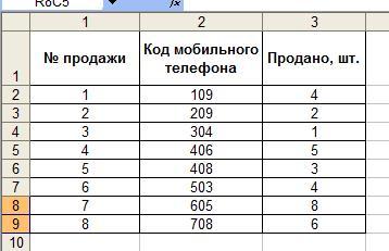 6. На листе Список продаж MSExcel создать таблицу, в которой будет список кодов проданных телефонов, количество и номер продажи.