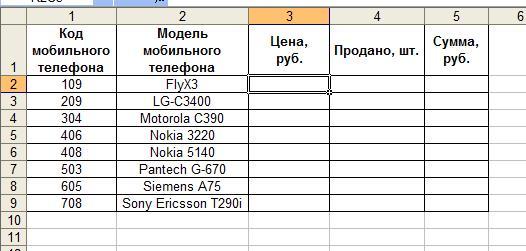 10. Заполняем графу Модель мобильного телефона таблицы «Табличные данные ведомости продаж» на листе Табличные данные ведомости продаж следующим образом:
