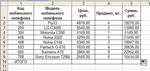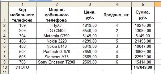 13. заполняем ячейку 510: = сумм (52:59) получим итоговую сумму по проданным телефонам.