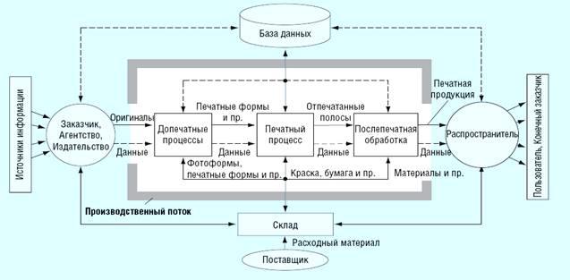 Рис.1. Схема производственного потока, а также потока материалов и данных для производства печатной продукции.