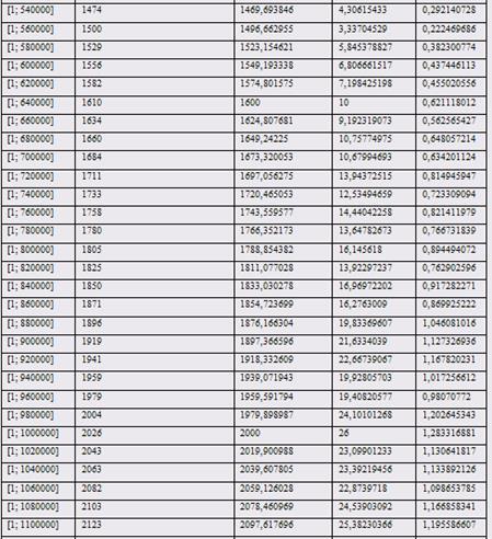 Из таблицы (см Приложение А), которую выводит программа, несложно подсчитать количество антипростых чисел для различных заданных отрезков. Например, от 1 до 1000 имеется 53 антипростых числа, от 1001 до 2000 – 24, от 2001 до 3000 – 18, от 3001 до 4000 – 19, от 4001 до 5000 – 13, от 5001 до 6000 – 13, от 6001 до 7000 – 12, от 7001 до 8000 – 11, от 8001 до 9000 – 11, от 9001 до 10 000 – 10 и т.д.