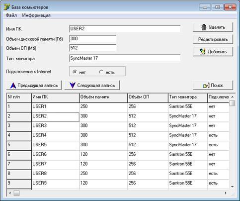 - вывод информации об отдельном компьютере из типизированного файла на экранную форму в отдельные поля ввода;