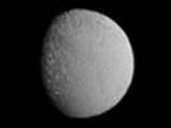 знаменита своей огромной трещиной-разломом, протяженностью 2000 км - три четверти длины экватора спутника! Фотографии Тефии, полученные от <Вояджера 2>, показали большой гладкий кратер с треть диаметра самого спутника, названный Одиссеем. Он больше, чем Гершель на Мимасе. К сожалению, на представленном снимке эти детали плохо различимы. О происхождении расщелины существуют несколько гипотез, в том числе и предполагающую такой период в истории Тефии, когда она была жидкой. При замерзании могла образоваться расщелина. Температура поверхности Тефии - 86 К.