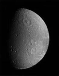 . На поверхности Дионы видны следы выброса светлого материала в виде инея, множество кратеров и извилистая долина.