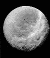 Это ледяной шар с коричневыми пятнами, на его полюсах видны светлые ледяные шапки.