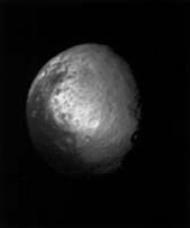 - никак не подтверждает свою внутреннюю деятельность. Неправильная форма спутника вызывает необычное явление: Каждый раз, когда гигантский Титан и Гиперион сближаются, Титан гравитационными силами меняет ориентацию Гипериона, что по изменяющемуся блеску спутника можно отследить с Земли. Неправильная форма Гипериона и следы давней бомбардировки метеоритами позволяют назвать Гиперион старейшим в системе Сатурна.