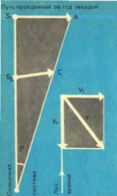 Расстояние между объектами на небе (например, звездами) изме- ряют углом, образованным лучами, идущими к объектам из точки на- блюдения. Такое расстояние называется угловым и выражается в градусах и его долях. При этом считается, что две звезды находятся недалеко друг от друга на небе, если близки друг другу направле- ния, по которым мы их видим (рис. 1, звезды А и В). Возможно, что третья звезда С, на небе более далекая от Л,в пространстве к А ближе, чем звезда В.