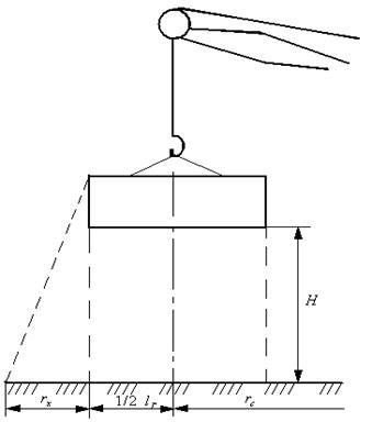 Досягаемость падающей детали будет зависеть от высоты подъёма Н, причём отклонение от проекции груза на горизонтальную плоскость будет равным и одинаково вероятным в любую из четырёх сторон. В плане зона досягаемости изображается в виде окружности. Расстояние возможного отлёта груза для определения границы опасной зоны принимается равным одной трети Н (рис. 5),