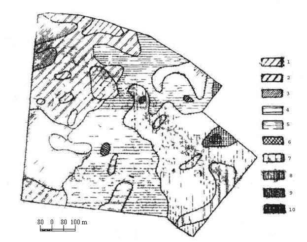 Условные обозначения: 1) супесчаные дерново-слабоподзолистые почвы на мощных песках; 2) супесчаные дерново-среднеподзолистые почвы на маломощных песках, подстилаемых моренной глиной; 3) супесчаные дерново-сильноподзолистые почвы на супеси, подстилаемой мореной; песчано-суглинистые; почвы на маломощном песчаном суглинке; 4) дерново-среднеподзолистые; 5)дерново-сильно подзолистые; 6) дерновые подзолы; пылевато-суглинистые почвы на лессовидном суглинке; 7) дерново-среднеподзолистые; 8) дерново-сильноподзолистые; 9) дерновые подзолы; 10) дерново-подзоло-глеевые почвы.