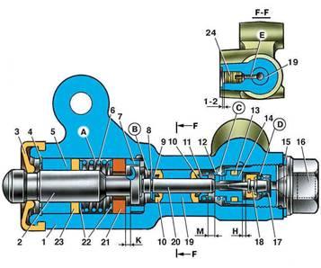 1 - корпус регулятора давления тормозов; 2 - поршень; 3 - защитный колпачок; 4, 8 - стопорные кольца; 5 - втулка поршня; 6 - пружина поршня; 7 - втулка корпуса; 9, 22 - опорные шайбы; 10 - уплотнительные кольца толкателя; 11 - опорная тарелка; 12 - пружина втулки толкателя; 13 - кольцо уплотнительное седла клапана; 14 - седло клапана; 15 - уплотнительная прокладка; 16 - пробка; 17 - пружина клапана; 18 - клапан; 19 - втулка толкателя; 20 - толкатель; 21 - уплотнитель головки поршня; 23 - уплотнитель штока поршня; 24 - заглушка; A, D - камеры, соединенные с главным цилиндром; В, С - камеры, соединенные с колесными цилиндрами задних тормозов; К, М, Н - зазоры; Е - дренажное отверстие.