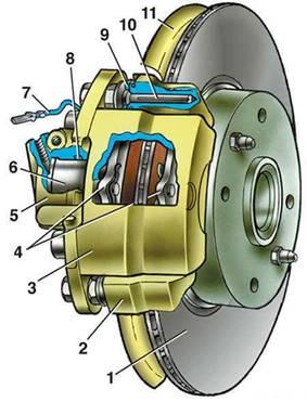1 – тормозной диск; 2 – направляющая колодок; 3 – суппорт; 4 – тормозные колодки; 5 – цилиндр; 6 – поршень; 7 – сигнализатор износа колодок; 8 – уплотнительное кольцо; 9 – защитный чехол направляющего пальца; 10 – направляющий палец; 11 – защитный кожух