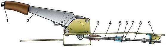 1 - кнопка фиксации рычага ручного тормоза; 2 - рычаг привода стояночного тормоза; 3 - защитный чехол; 4 - тяга; 5 - уравнитель троса; 6 - регулировочная гайка; 7 - контргайка; 8 - трос; 9 - оболочка троса