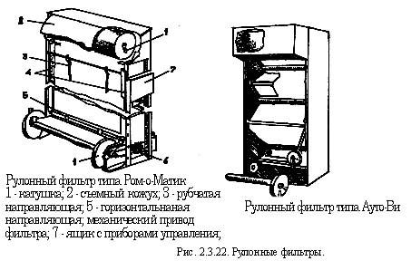 Рулонные волокнистые фильтры бывают плоские и складчатые (ФРУ). В верхней и нижней части фильтров установлены катушки, которые позволяют перематывать фильтрующий материал по мере загрязнения.