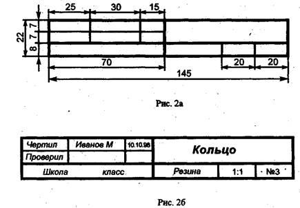 На чертежах в правом нижнем углу располагают основную надпись, содержащую сведения об изображённом изделии. Форму, размеры и содержание её устанавливает стандарт, На учебных школьных чертежах основную надпись выполняют в виде прямоугольника со сторонами 22x145 мм (рис. 2а). Образец заполненной основной надписи показан на рис 2б