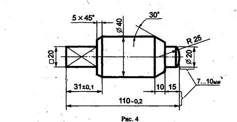 Размерные линии 'Ограничивают стрелками, которые остриём должны касаться выносных линий (размеры 110, 30, 15, 0 20 и другие на рис. 4), линий контура (размер 040) или осевых линий.