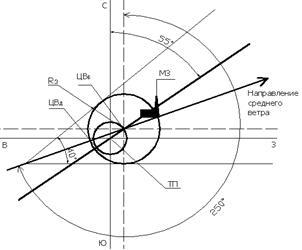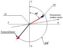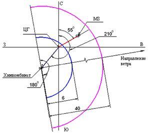 5. Начертить (на листе ватмана А1) расположение завода (цеха) относительно центра города и химкомбината, и район возможного химического заражения местности при инверсии и скорости ветра 1 м/с; α2