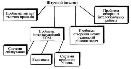 Створення систем штучного інтелекту (ШІ) — це багатоаспектне дослідження, яке потребує вирішення кількох груп проблем. На рис.1 наведено чотири групи проблем досліджень у галузі штучного інтелекту. Перша група проблем пов'язана з імітацією творчої розумової діяльності людини. Сутність цього напрямку полягає в розробці комп'ютерних програм, які здатні до відтворення процедур, пов'язаних із творчими розумовими процесами. До таких процедур можна віднести гру в шахи, математичні задачі тощо. Частка робіт, пов'язаних з імітацією творчих процесів у загальному обсязі робіт, що мають на меті створення систем з ШІ, є невеликою. Ці дослідження, насамперед, цікаві з погляду психологів, а також для вироблення фундаментальних положень теорії ШІ.