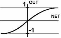 В штучному нейроні з активізаційною функцією (рис.5) блок, позначений F, приймає сигнал NET і видає сигнал OUT. Якщо блок F звужує діапазон зміни величини NET так, що при будь-яких значеннях NET значення OUT належать деякому кінцевому інтервалу, то F називається «стискаючою» функцією. Як «стискаюча» функція часто використовується сигмоїдна функція.