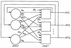 Рис.13 Одношарова НМ зі зворотними зв’язками. Пунктирні лінії позначають нульові ваги.