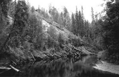 | Рис. 1. Загубленные таежные реки - верный спутник "освоенной" человеком тайги. Пяозерский лесхоз, Республика Карелия (река Карманга). |