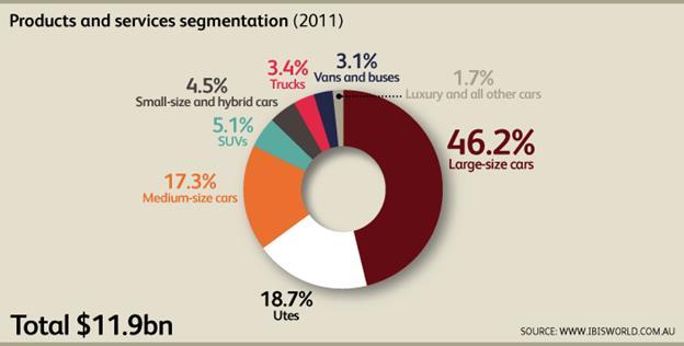 Устранить недостаток производства гибридных и малого размера автомобилей будет призвана Toyota Camry и Holden Cruze (с 1,8 литровым двигателем). В результате, этот небольшой сегмент, быстро набирая обороты, поднялся до 4,5% практически с 0 (см. рис.1 Сегментация автомобильного рынка Австралии) . В рамках такого деления малым будет считаться легковой автомобиль с четырех или шестицилиндровым двигателем объемом от 1,5 - 1,9 литра. К малым будут присоединены и гибридные автомобили. Рост в этом сегменте стал результатом сдвига потребительских предпочтений в сторону меньших автомобилей, спрос на которые до последнего времени был удовлетворен за счет импорта. Отечественные производители в настоящее время также следуют этой тенденции благодаря субсидиям правительства.