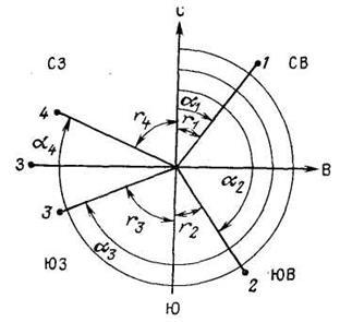1. Связи между румбами и дирекционными углами по четвертям. Чертеж по четвертям.