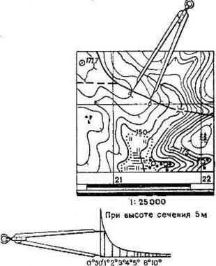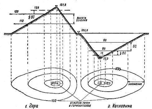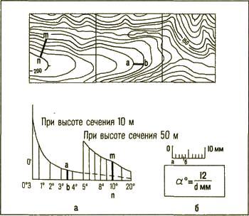 Расстояние по высоте между двумя смежными горизонталями, взятыми на одном скате, называется высотой сечения, а расстояние между горизонталями по плану — заложением. Чем круче скат, тем меньше величина заложения, и наоборот Для определения крутизны ската измеряют кратчайшее расстояние между соседними горизонталями и по шкале подбирают соответствующее ему заложение, против которого читают крутизну ската в градусах. Чтобы определить направление ската по горизонталям, на некоторых из них ставятся перпендикулярные черточки—скатоуказатели (бергштрихи), «смотрящие» своим свободным концом в сторону понижения