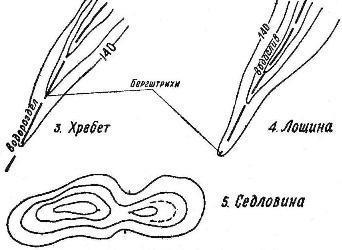 Некоторые формы рельефа изображаются не горизонталями, а особыми условными значками. Так, обрывы, овраги, валы, ямы показываются линией с зубчиками, обращенными в сторону крутого склона. При пользовании мелкомасштабными картами туристы могут встретить изображение рельефа способом отмывки (сгущения теней) и гипсометрическим («чем выше, тем темнее»).