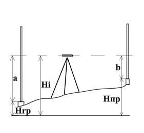 ГИ – высота от уровня Б. моря до луча нивелира. Вычисление проводится только для тех станций, с которых нивелировались промежуточные точки. ГИ = задней отметке/или передней/ точки + отсчет по черной стороне рейки, стоявшей на этой точке. ГИ = Н А + а