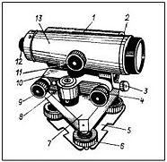 Нивелир Н-3; 1- корпус,2 — мушка,3,8 — уровни,4 — наводящий винт,5 — пружна пластинка,6 — подъёмные винты,7 — подставка,9 — элевационный винт,10 — опорна площадка,11 — винт кремальеры,12 — окуляр,13 — зрительная труба