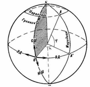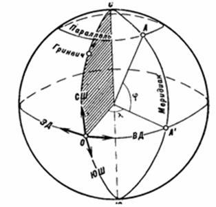 надо мысленно раскроить поверхность земли плоскостями, расположенными перпендикулярно плоскости экватора, проходящего через С и Ю полюса. Линии пересечения этих плоскостей с поверхностью земли образуют Меридианы.