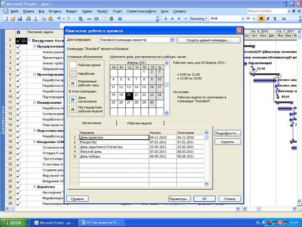 2.Планирование графика работ. Настройка календаря с учетом графика работ, праздничных и выходных дней.