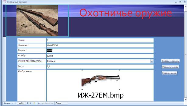 · создание базы данных «Справочник охотничьего оружия», в которой будет храниться и обрабатываться информация о охотничьем оружие. В нее будут входить информация о оружие, его описание и изображение.