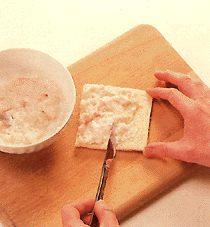 Смешайте сало, креветки, соль, кукурузную муку и яичный белок. Приправьте белым перцем. Намажьте полученным фаршем ломтики хлеба и посыпьте сверху толстым слоем зерен кунжута. Вдавите кунжут в фарш и разрежьте каждый ломтик на 4 треугольника. |