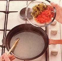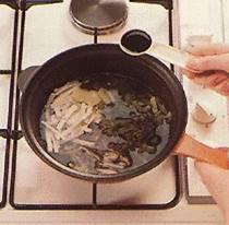 25г. тонко нарезанных сычуаньских консервированных овощей; 25г. тонко нарезанных китайских маринованных зеленых овощей; 18г. ломтика свежего имбирного корня; 250г. воды;