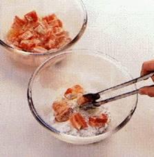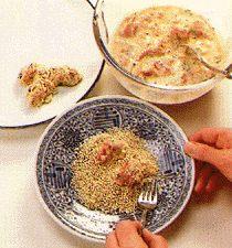 8 г свиного сала 50 г очищенных креветок 1.5г. соли 10г. кукурузной муки 1 яичный белок белый перец 40г. белого хлеба без корок 30 г кунжутных зерен 120г. растительного масла. |