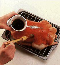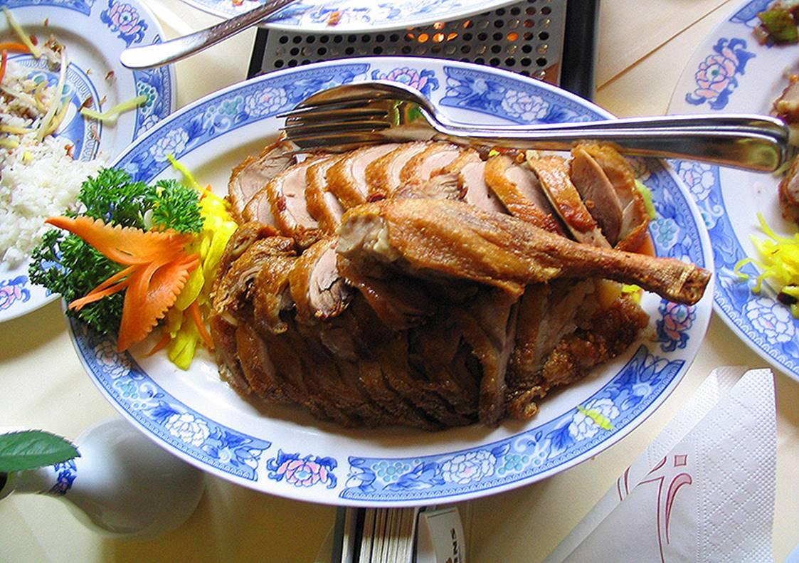 Одним из самых известных блюд китайской кухни является пекинская утка. Из одной тушки получается примерно 120 кусочков. На стол ставят нарезанное мясо, тонкие блины, густой сладкий бобовый соус и кусочки лука. Палочками берут один блин, кладут его на ладонь левой руки, обмакивают палочки в соус и намазывают блин. Затем накладывают на блин лук и мясо, двумя руками сворачивают его в трубочку, загибают концы и едят как пирожок.