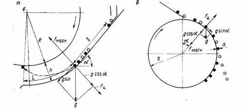 Режим удерживания. В этом случае руда подается в верхнюю часть барабана и перемещение ее через рабочую зону сепаратора происходит по криволинейной траектории (рисунок 1б). На магнитное зерно при разделении в воздушной среде действуют следующие силы (отнесенные к зерну массой, равной единице):