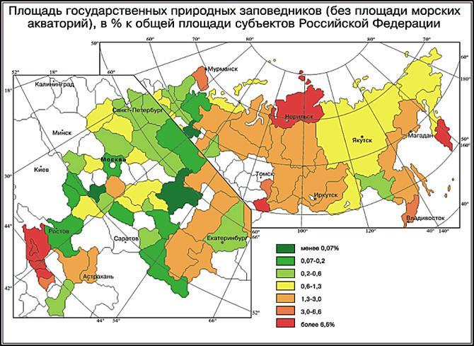 В Российской Федерации наиболее традиционной формой территориальной охраны природы, имеющей приоритетное значение для сохранения биологического разнообразия, являются государственные природные заповедники (табл. 1). Система государственных заповедников как эталонов ненарушенных природных территорий является предметом заслуженной гордости отечественной науки и природоохранного движения России. Сеть заповедников создавалась в течение восьми десятилетий. На 2000г в России 99 государственных природных заповедника общей площадью 33,152 млн. га, в том числе сухопутные (с внутренними водоемами) – 26,678 млн. га, что составляет 1,56% территории России. Заповедники расположены на территории 18 республик в составе Российской Федерации, 4 краев, 35 областей, одной автономной области, 7 автономных округов. В соответствии с законодательством государственные природные заповедники имеют статус природоохранных, научно-исследовательских и эколого-просветительских учреждений.