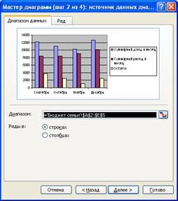 По результатам имеющихся значений о бюджете семьи на листе Бюджет семьи построим гистограмму по трем показателям (рис. 13). Диаграмма строится с помощью мастера построения диаграмм по следующим шагам: