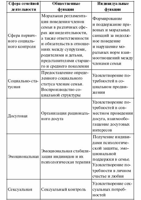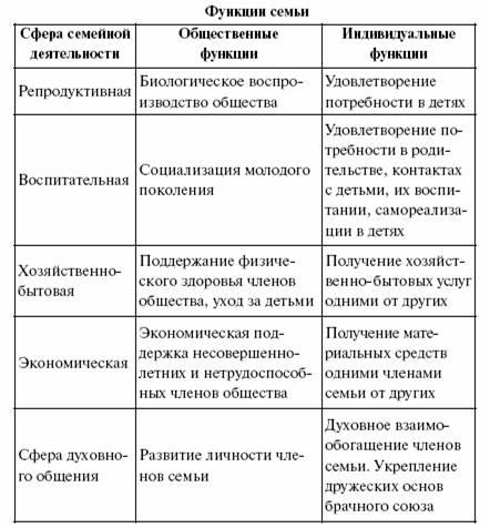 Функции семьи, помимо общественных отношений, отражают также и отношения семьи и личности. К числу наиболее важных функций семьи относятся: первичная социализация и воспитание детей, организация быта, организация личного потребления, психологическая и материально-бытовая поддержка пожилых, инвалидов, нетрудоспособных членов семьи. Более полная классификация функций семьи разработана М. С. Мацковским, которая представлена в таблице 1.[2]