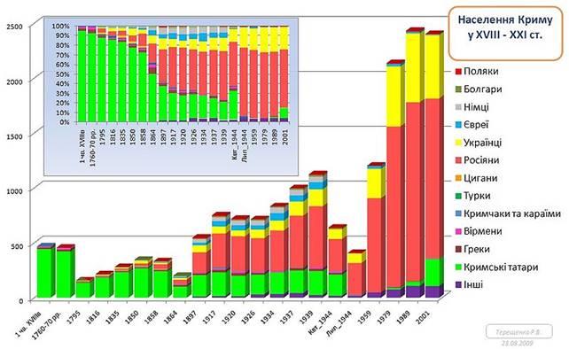 За годы независимости Украины крымскотатарское население автономии возросло в 6,4 раза. В целом, этнический состав населения Крыма, в результате массового возвращения на полуостров в конце 80-х крымских татар, репатриации прежде депортированных армян, болгар, немцев и греков, потерпел существенные изменений.