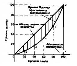 Теоретическая возможность абсолютно равного распределения дохода представлена биссектрисой, которая указывает на то, что любой данный процент семей получает соответствующий процент дохода. Это значит, что если 20, 40, 60% семей получает соответственно 20, 40, 60% от всего дохода, то соответствующие точки будут расположены на биссектрисе. Кривая Лоренца представляет собой кумулятивное распределение численности населения и соответствующих этой численности доходов. В результате она показывает соотношение процентов всех доходов и процентов всех их поручателей. Если бы доходы распределялись равномерно, то есть 10% получателей имели бы десятую часть доходов, 50% - половину и так далее, то такое распределение имело бы вид линии равномерного распределения. Неравномерное распределение характеризуется кривой Лоренца, то есть линией фактического распределения, стоящего от прямой тем дальше, чем больше дифференциация. Например, 20% населения с самыми низкими доходами получили 5% общего дохода, 40% с низкими доходами - 15% и так далее.