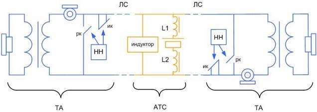 АТС осуществляет питание абонентских линий абонента постоянным напряжением 60В (за рубежом 48В). При снятой телефонной трубке к абонентской линии в качестве нагрузки подключается микротелефонная пара трубки, в абонентской линии протекает ток, в результате падения напряжения в кабельной линии напряжение на линейных зажимах ТА может уменьшаться, до величины 5 ÷ 15В. Индуктор служит для посылки сигнала вызова абоненту.
