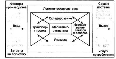 На рис. 1.6 видно, что транспорт занимает в управленческой производственной подсистеме значительную часть. В свою очередь рационализацию выбора транспортной схемы обеспечивает транспортная логистика. Главная цель маркетинг-логистики заключается в обеспечении готовности поставки товара покупателю с высоким уровнем сервиса их обслуживания и разумными затратами.