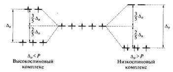Схема образования высокоспиновых и низкоспиновых комплексов: