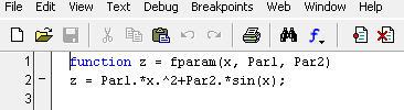 Функции quad и quadl позволяют находить значения интегралов, зависящих от параметров. Аргументами функции, вычисляющей подынтегральное выражение, должна быть не только переменная интегрирования, но и все параметры. Значения параметров указываются через запятую, начиная с шестого аргумента quad или quadl. [1, C.270]